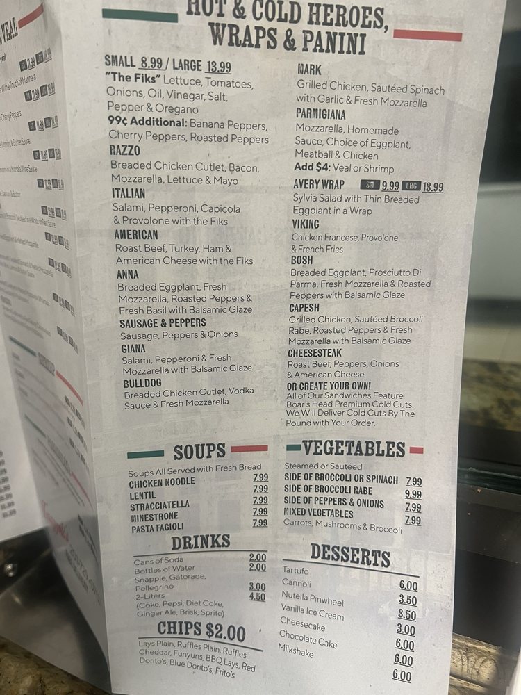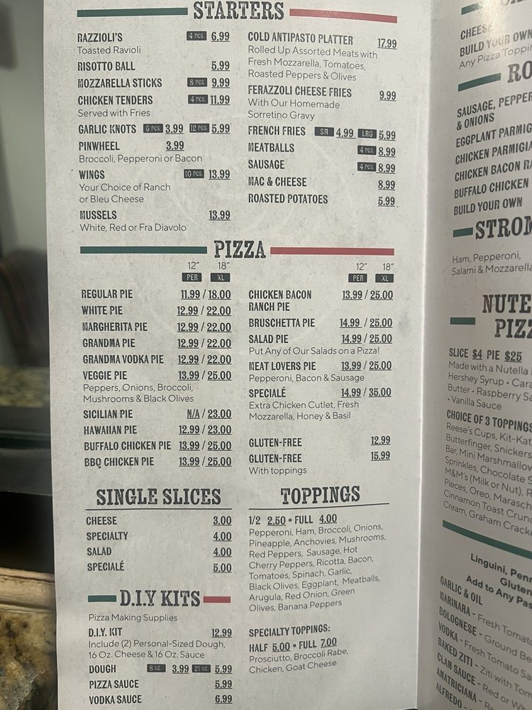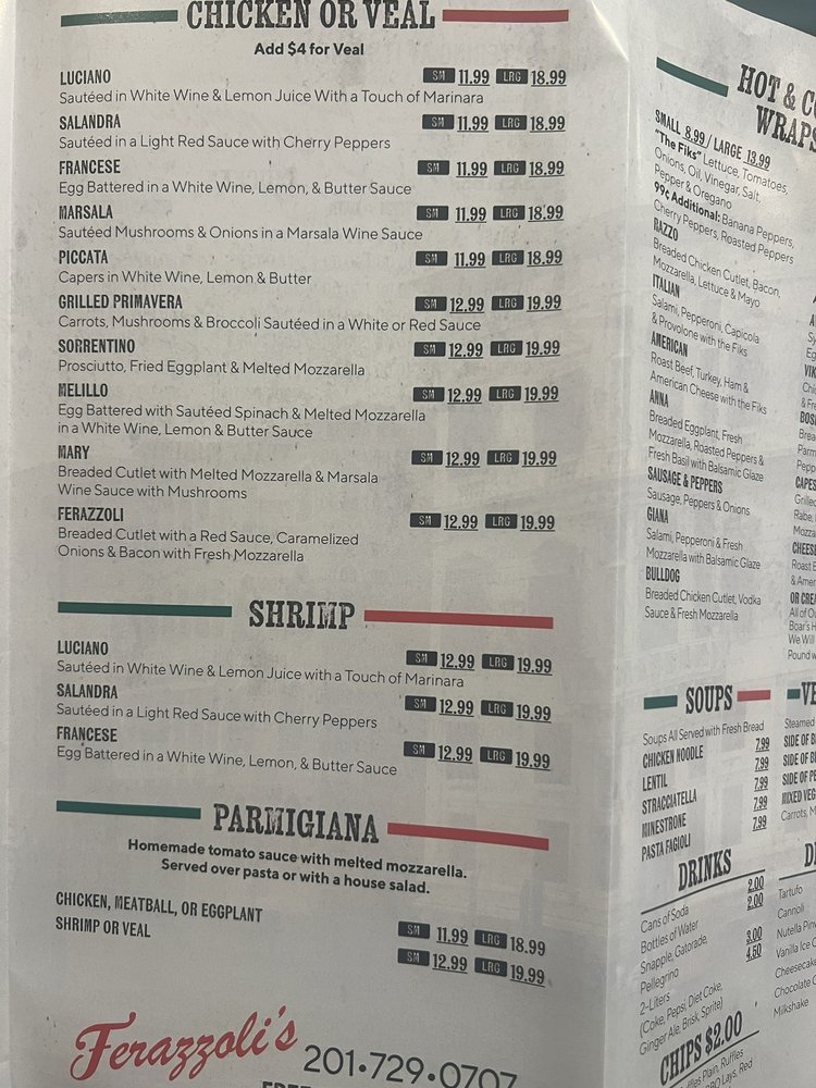 Ferazzoli's Italian Kitchen, located in Rutherford, NJ, offers a diverse menu of deli, pizza, and Italian dishes. With options for vegan, gluten-free, and meat lovers alike, this restaurant caters to a wide range of dietary preferences. Customers rave about the generous portions, fresh ingredients, and flavorful sauces. The hot and cold heroes, wraps, and panini are a crowd favorite, with sandwiches like the Razzo and Anna standing out for their unique combinations. The pizza selection is also impressive, featuring classics like the Grandma Pie and innovative creations like the Salad Pie. The chicken and veal dinner options, such as the Luciano and Marsala dishes, are praised for their tender meat and flavorful sauces. Overall, Ferazzoli's Italian Kitchen is a go-to spot for delicious Italian meals with excellent service and a welcoming atmosphere.